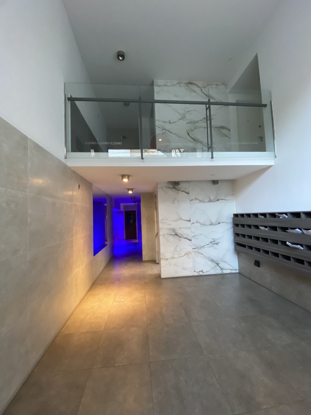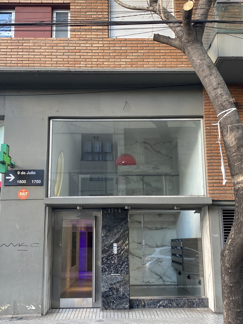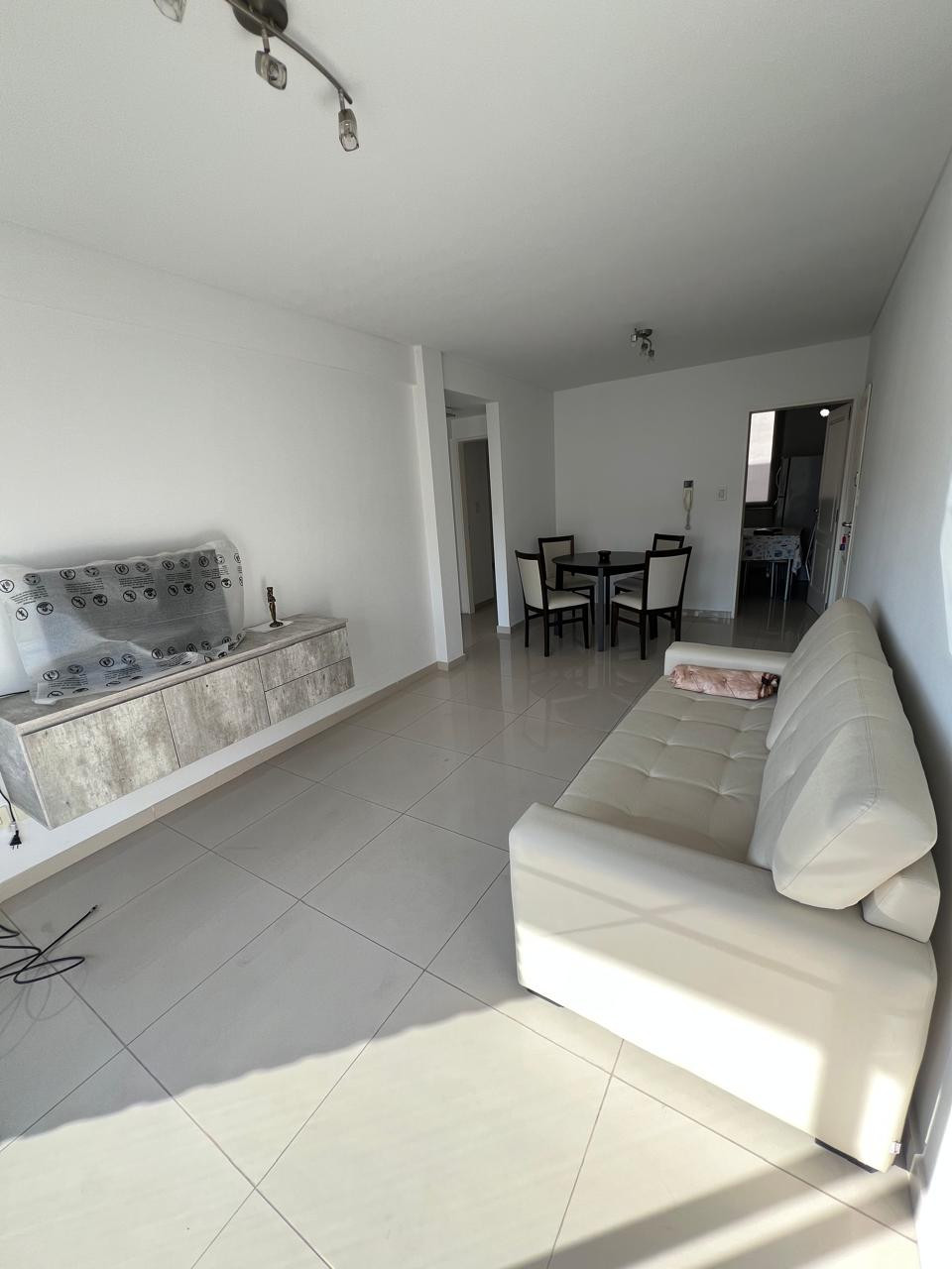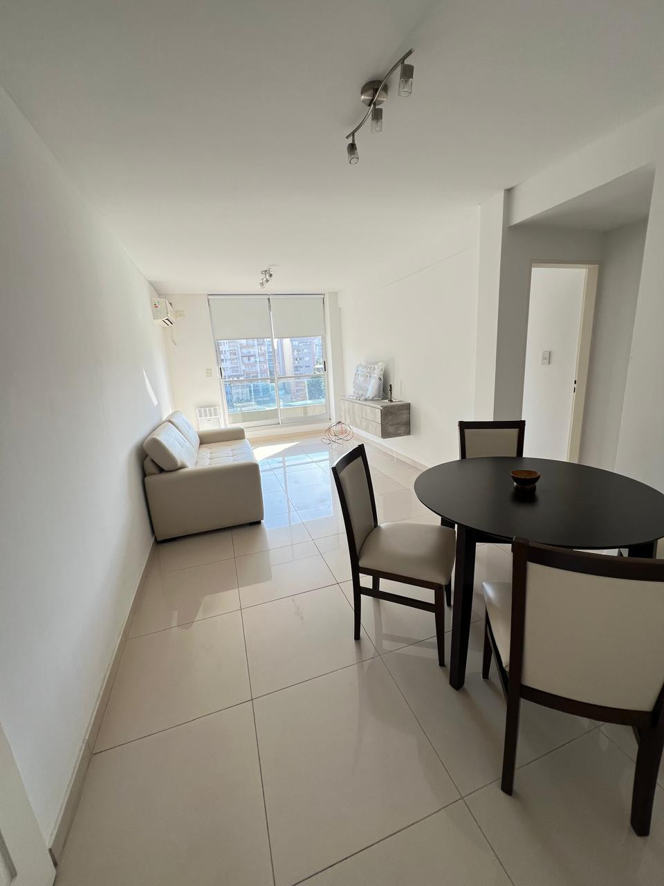 LIVING– COMEDOR (7m x 3m) c/ Puerta Blindada, portero visor y Pisos porcelanato. Sillón, amoblamiento colgado en pared. Mesa con sillas. Calefactor y Aire acondicionado Split. Artefactos iluminación acero.