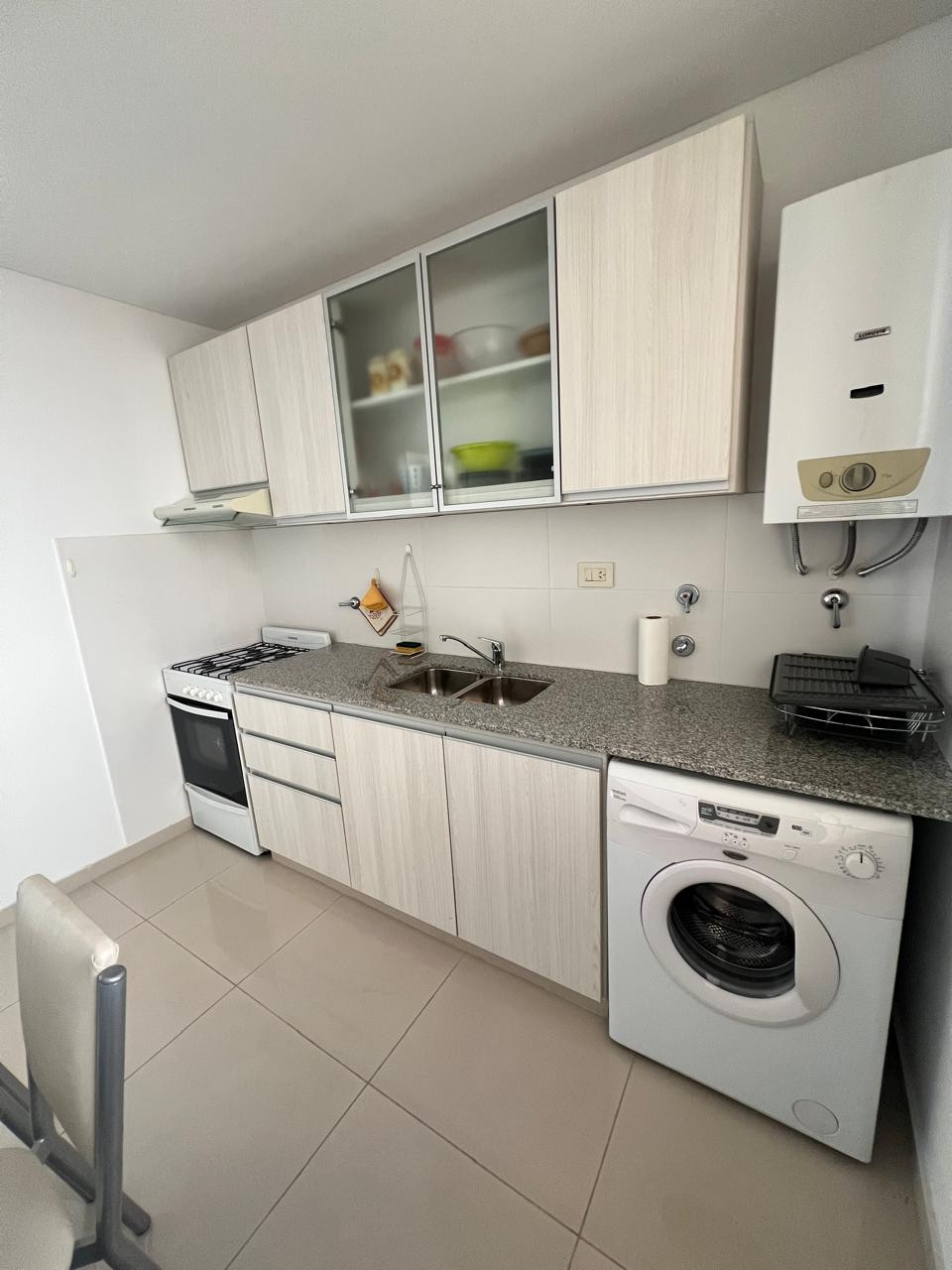 COCINA- COMEDOR: (3,00 x 3,00) con Pisos porcelanato, Bajomesada, Alacenas, Cocina, Extractor aire, Calefón y lugar para colocación lavarropas. Lugar p/ mesa. Mesas con sillas, Heladera y Lavarropas. Artefacto iluminación acero.